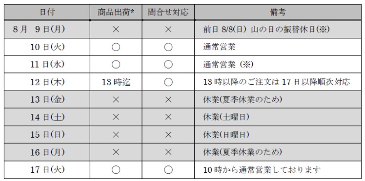(※) 例年8月11日は祝日(山の日)ですが、2021年は8月8日が山の日にあたり (翌8月9日が振替休日)、当社では今年の8月11日は通常営業しております。
