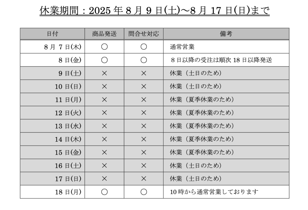 つきましては、商品の発送、お問い合わせの対応は下記の通りとさせて頂きます。